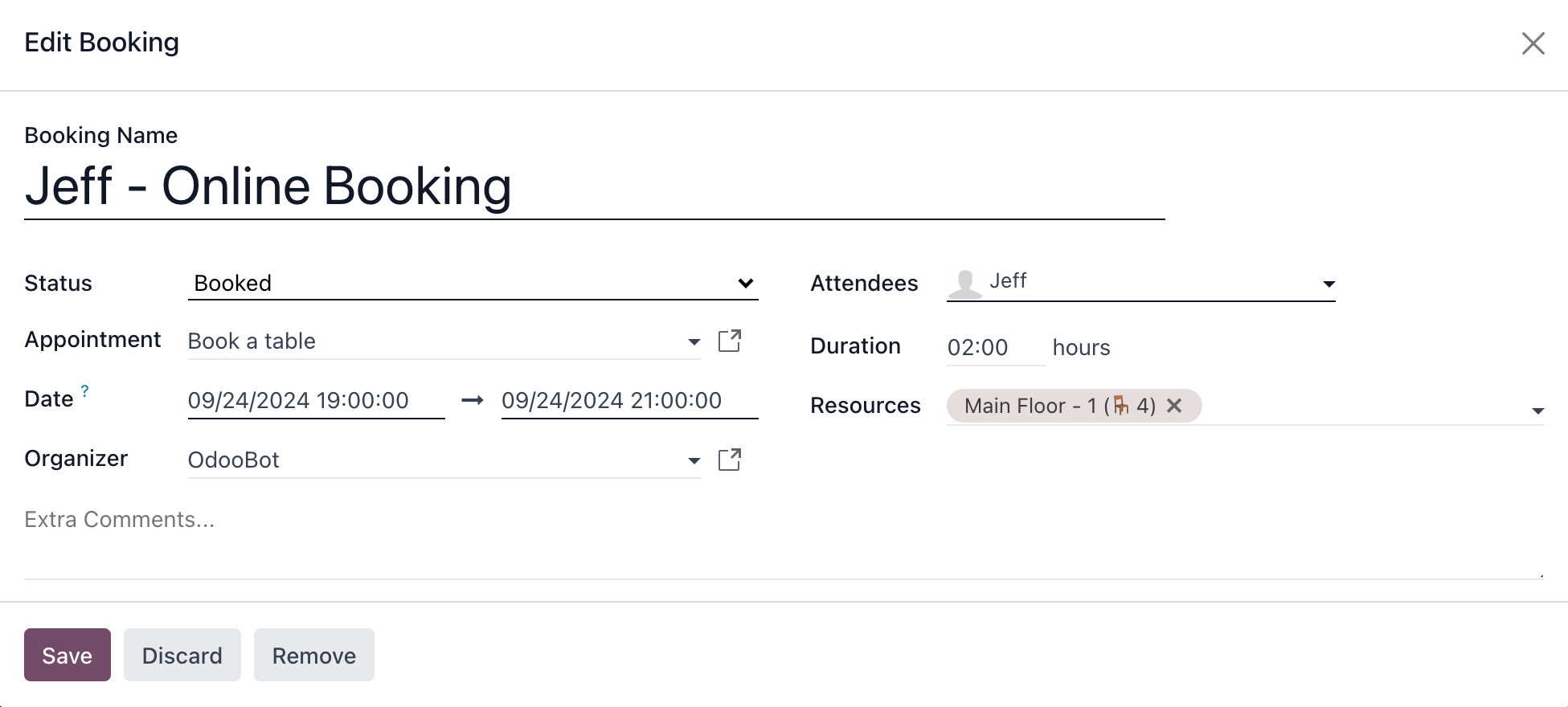 Online-Tischreservierung. Kunden können Tische online mit Odoo Termine buchen. Reservierte Tische erscheinen auf deinem anpassbaren Raumplan, der einfach mit dem Grafikeditor bearbeitet werden kann.