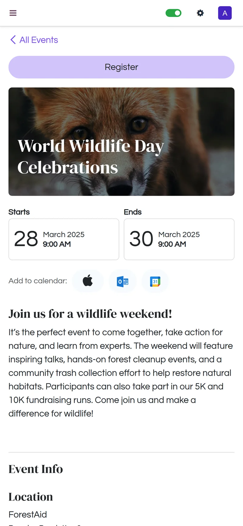 Nutze Seitenvorlagen, um für deine Veranstaltungen zu werben, Spenden zu sammeln und Termine zu buchen.