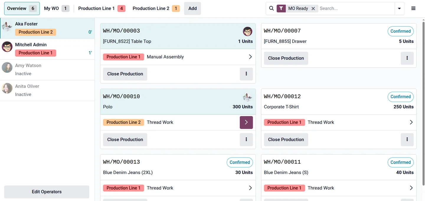 Mit Odoo Werkstatt können deine Mitarbeiter ganz einfach jeden Produktions- und Qualitätsschritt verfolgen und bestätigen.