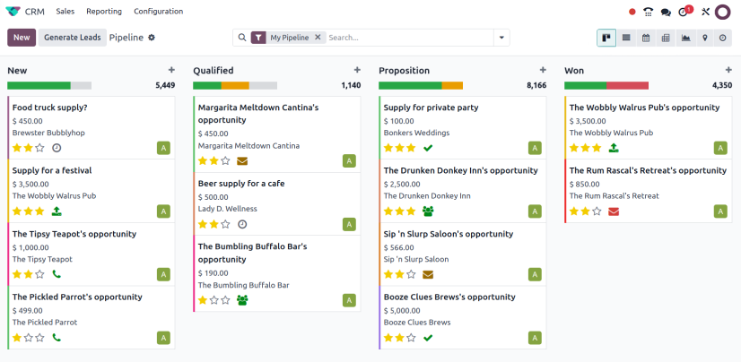 Customer-centric selling. Restaurants, shops, individual clients. Overview all your leads at a glance on Odoo's CRM pipeline, and schedule activities to never miss a follow-up again.
