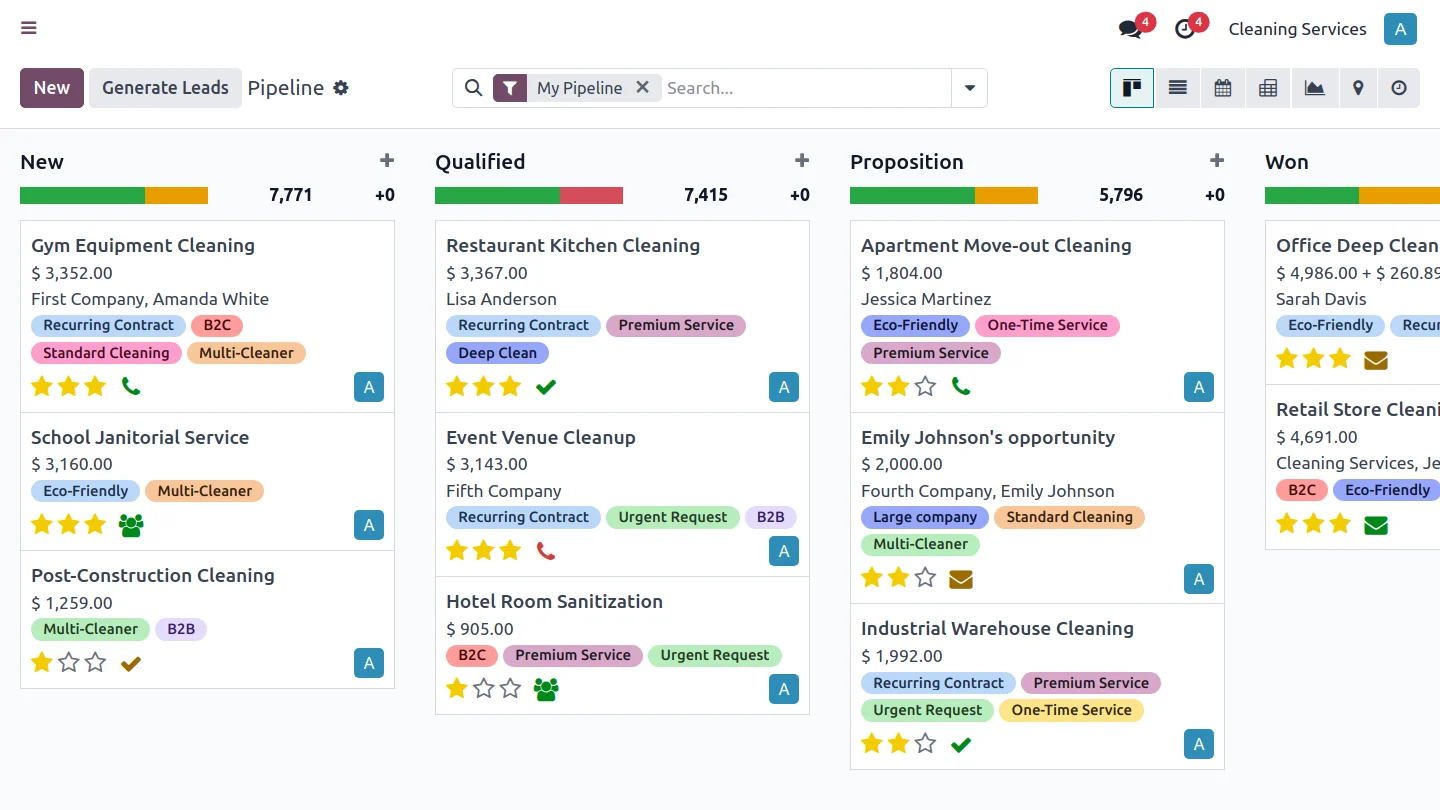Centralized leads. Odoo's CRM pipeline allows you to capture and nurture every lead, whether it comes from your website, email, WhatsApp, or else.