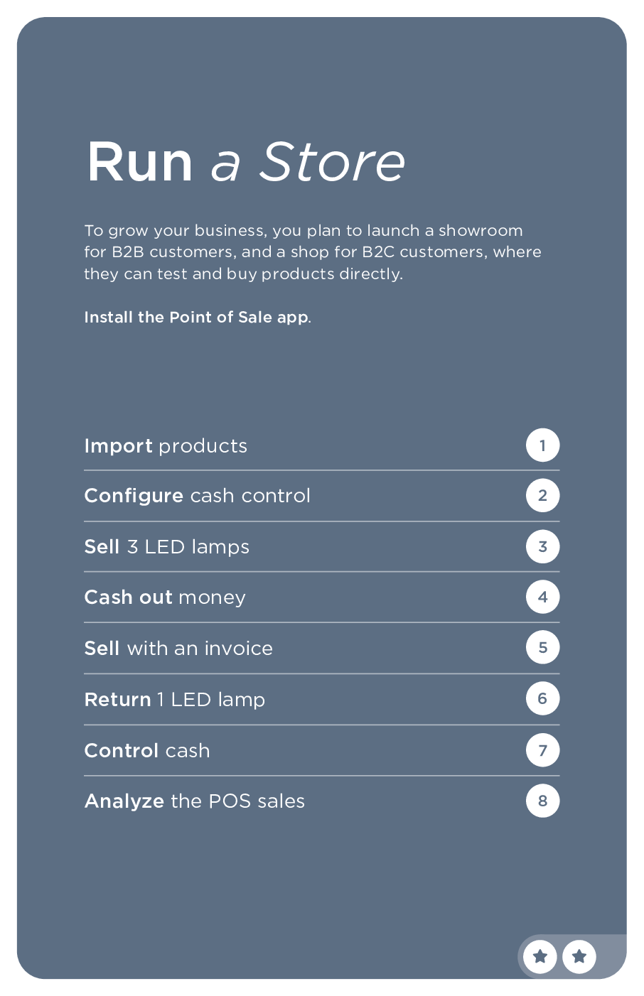 Je begint met het opzetten van de processen van een eenvoudig detailhandelsbedrijf en breidt vervolgens uit door een productielijn in te voeren, een e-commerceplatform op te zetten, een fysieke winkel te openen en nog veel meer!