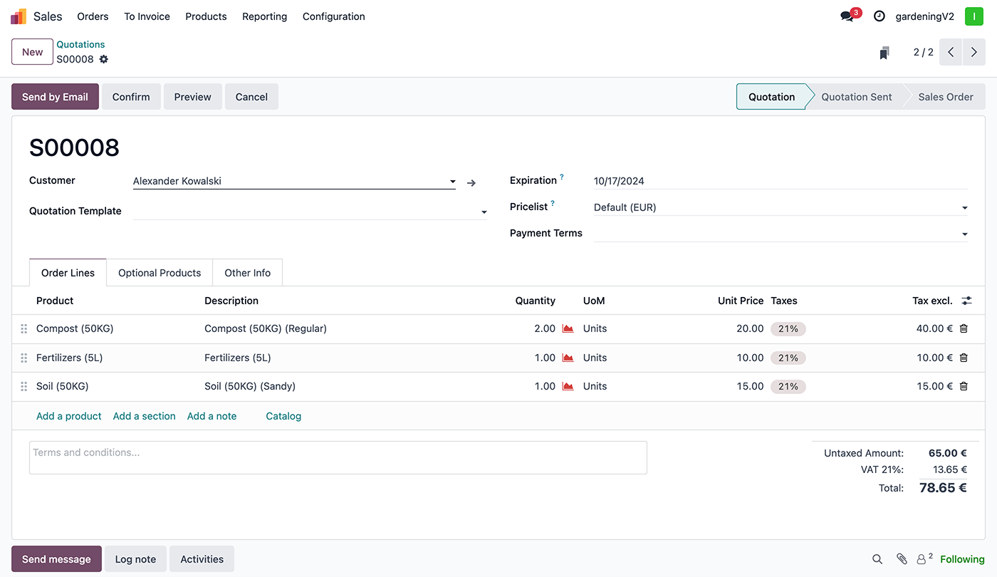 Odoo allows you to manage your entire garden design company. Gather leads, create quotations, invoice customers, and handle projects from conception to completion - all in one centralized platform.